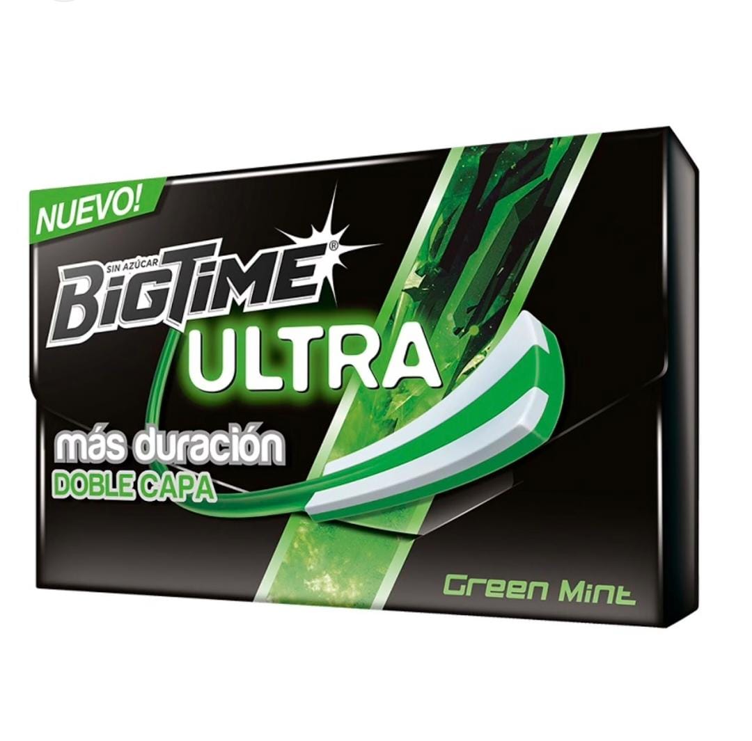 El producto es un chicle BigTime Ultra Green Mint. Sabor: Menta intensa. Características: Es un chicle sin azúcar con tecnología de «doble capa» para mayor duración.